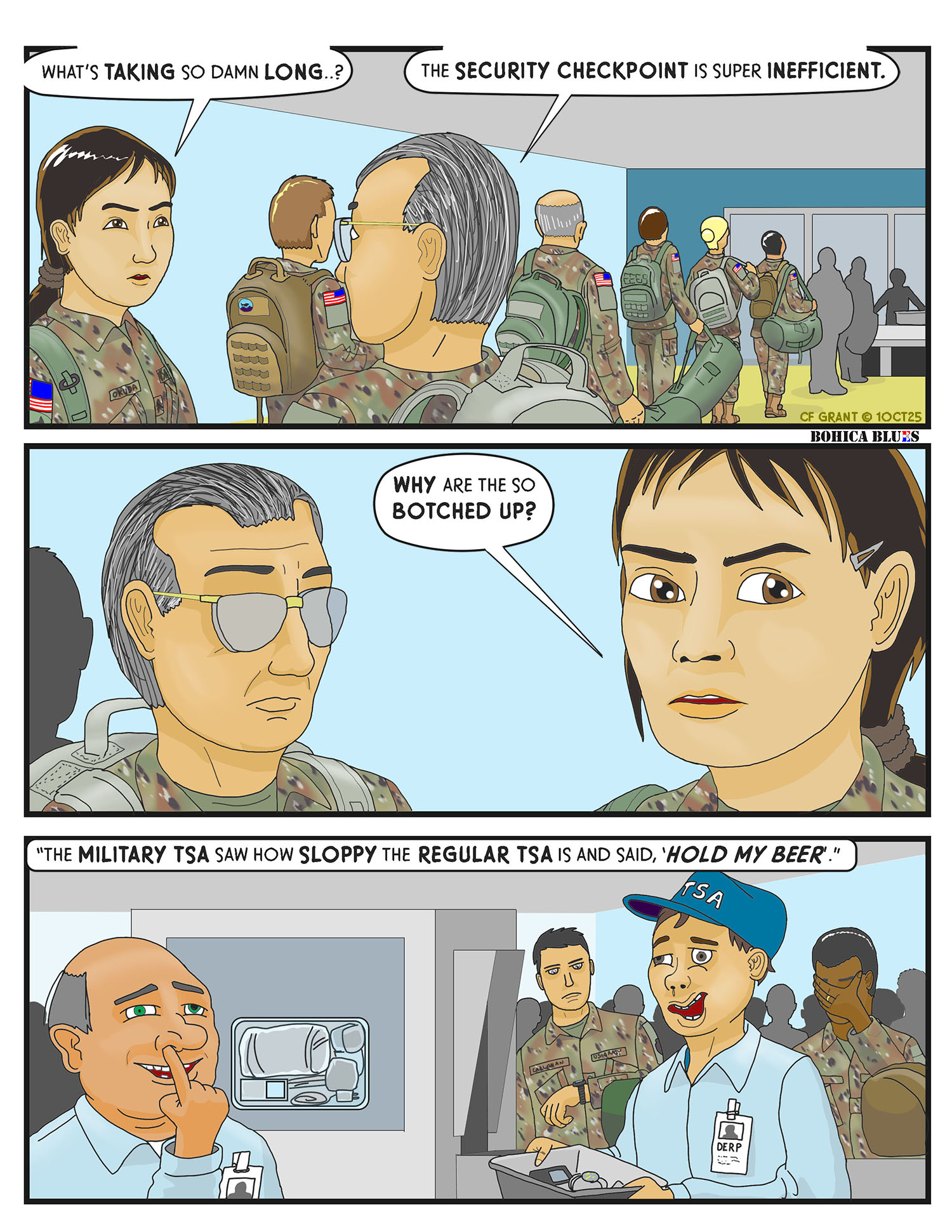 And they were so slow! Wow, it was an exercise in chaos. We’d already been up most of the night to begin with (not sure why) and they just could not get things to happen in a smooth and efficient manner. None of were carrying anything unusual; we didn’t have weapons with us at all and there were a few “secret squirrel” things they were few and ordinary stuff for any Battalion rotating through– nothing should have been a surprise.