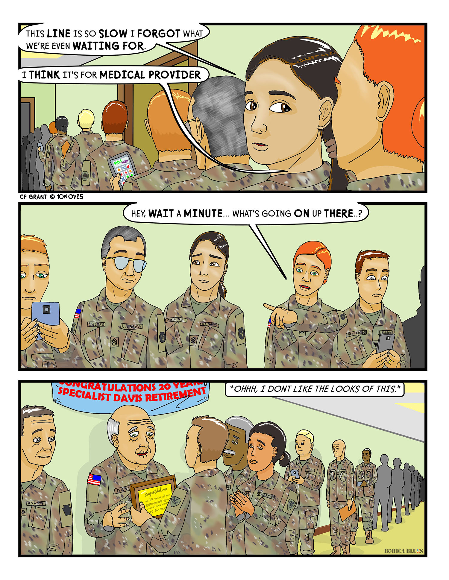 The idea that some Specialist up ahead is getting his 20-year retirement party while standing in line would not surprise me a bit.